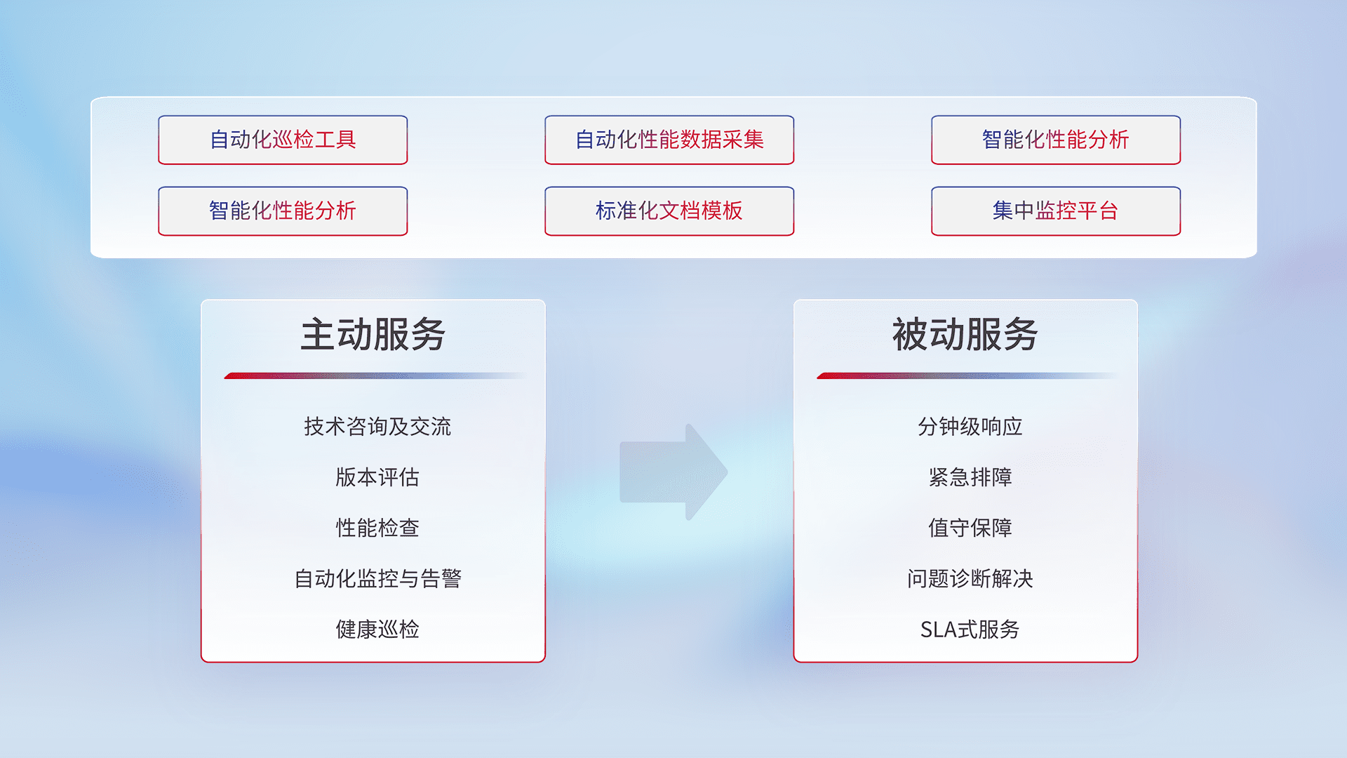 智能化工具和标准化文档,,保障服务质量,,提供主动服务(包含技术咨询、、、、版本评估、、性能检查、、、自动化监控与告警、、、健康巡检)和被动服务包含(分钟级响应、、紧急排障、、、值守保障、、、问题诊断解决、、、SLA服务)。。。。